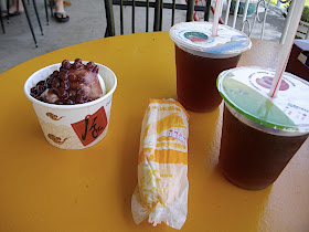 以前先要買票券, 再到販售人員那裡兌換冰品。我最喜歡這裡的紅茶, 服務人員會用鋼杯乘好一杯紅茶, 倒給購買的客人。現在則是封好一杯一杯的, 自行拿取, 再去結帳, 完全不同的結帳方式, 當然裡頭的擺設也完全不一樣了。我自然是取了一杯,「噢!是兩杯。」再點了兩份冰品。
