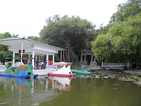 踩著踩著, 瞧瞧岸邊, 有人在釣魚 (雖然我沒看得湖中有什麼魚類), 也有散步的人群, 更有著「在那裡採野花,結草卦,抱兒攜女,打情罵俏。」的男女。採野花的當然是沒有, 處於熱戀中的男女可就不少了。