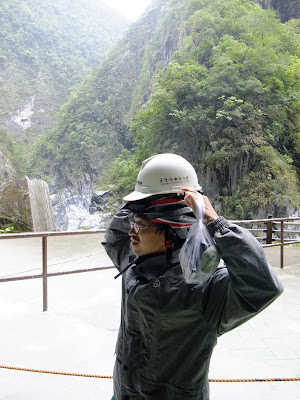 這是九曲洞提供的安全帽, 由於我自己已經戴了單車用安全帽, 自然不需要再借這頂, Lance 則是要體驗這頂安全帽, 所以借來戴戴, 我則是戴了幾秒鐘來做個紀念。