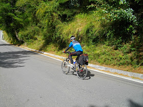 早上八點左右, 我踩著踏版開始前進了。路上藍天白雲、青山綠樹、彎延繚繞的公路,