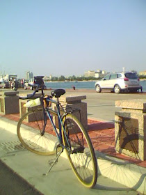 不知道是不是這時間比較沒人, 路上三三兩兩, 單車不算多。往右邊望去, 一望無際的河面, 不知道是你一條河, 河面上還有著一艘船, 是從哪裡來的呢?我疑惑的思考著 ...