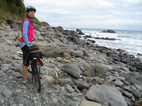 討人厭的岩石一座又一座的呈現在眼前, Lance 和我奮力扛車, 番過一座又一座的大石, 有時候我們兩個需要相互合作, 一人先跨過, 另一人在把單車往前扛, 以接力的方式, 前方的人再把單車接過去, 異常的辛苦。在某處跨越瀕臨大海的岩石時, 由於不知道怎麼把我的單車扛過去, 僵持在該地一陣子, 結果就被海浪打到, 把整雙鞋子都浸溼了。