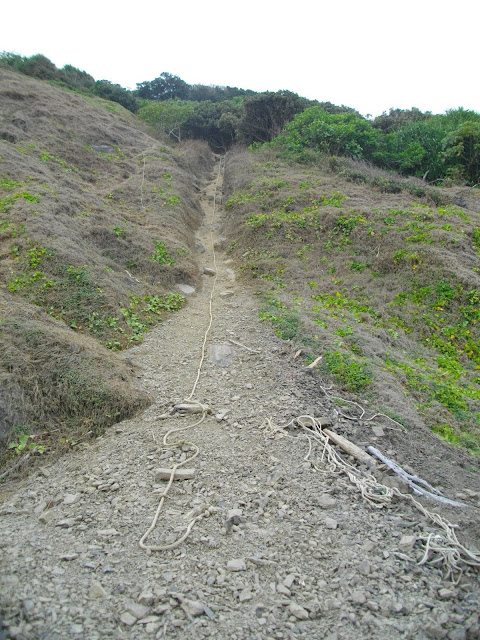 這次似乎順多了, 我頂起後三角, 讓前輪貼著步道, 後輪懸空, 右手用力抓緊繩子, 藉由前輪滾動的方式, 順利的滑了一跤, 阿, 不是, 是滑了下來。因為需要抓緊繩子以及沿著步道下滑, 所以手套很重要, 我穿的是打壘球用的手套, 腳上穿的則是 gore-tex 登山鞋, 由於步道有著泥沙、小碎石, 鞋子不夠專業, 可能會不太舒適。就這樣, 下滑的速度及順暢度都增加了。