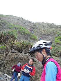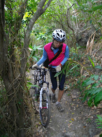 一開始的這段, 土石下滑的很厲害, 除了手上的單車, 還需注意腳下, 免得腳下一滑, 連人帶車滑了下來, 那可不是好玩的。在一陣子的手忙腳亂後, 我們兩人終於先把一台單車扛上去了。「按! 還真不是普通的累。」右手都快沒力了。