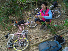 在某個下滑處, Lance 遺失了打氣筒, 其實也不是沒找到, 可是那打氣筒高掛在上風處, 我們正努力下滑中, Lance 不想再爬上去拿那個打氣筒了。我想也沒多少人扛著單車想在上去拿, 當作做公德, 如果你剛好也是帶著單車, 又那麼剛好破胎, 那就幫上忙了。我的前燈在下滑時也碰掉了, 可是運氣很好, 在往上爬時, 竟然讓我發現, 失而復得, 可喜可賀。