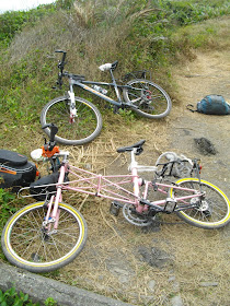 剩下的鵝卵石與漂流木可以算是平路了, 一路牽牽扛扛, 通過了不算短的距離後, 終於抵達可以騎車的道路了。