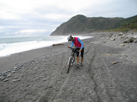 下到海岸線後, 兩人心情真是開心, 總算結束了扛車地獄了。這裡到處是圓滾滾的鵝卵石以及殘破不堪的漂流木。要繼續前進的話, 還是要牽車, 但是我們已經覺得這是平地了。