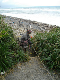 討人厭的岩石一座又一座的呈現在眼前, Lance 和我奮力扛車, 番過一座又一座的大石, 有時候我們兩個需要相互合作, 一人先跨過, 另一人在把單車往前扛, 以接力的方式, 前方的人再把單車接過去, 異常的辛苦。在某處跨越瀕臨大海的岩石時, 由於不知道怎麼把我的單車扛過去, 僵持在該地一陣子, 結果就被海浪打到, 把整雙鞋子都浸溼了。