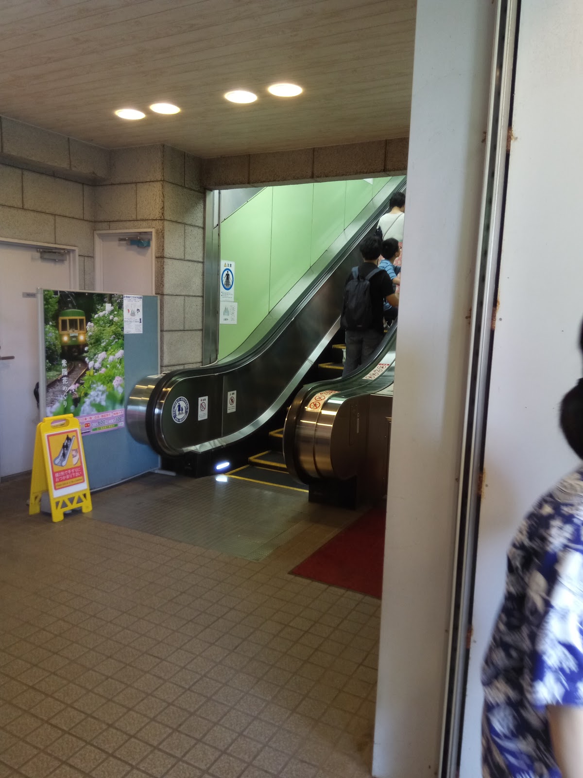 隨著小徑的向上而去, 我也慢慢地登上高地, 不知道爬了多高, 看到一間神社, 而附近有個售票亭, 販售著電動樓梯的門票, 真是有趣, 還特地為了體力不支的遊客建了一個電扶梯。而行有餘力的其他人則可以沿著旁邊的山路, 繼續往上, 試試自己的體力。我因為時間因素, 到這裡就結束我的江之島一行, 畢竟對我來說, 更有趣的是搭乘路面電車 -「江島電鐵」, 我可是買了一日券, 不去搭個過癮怎麼行。